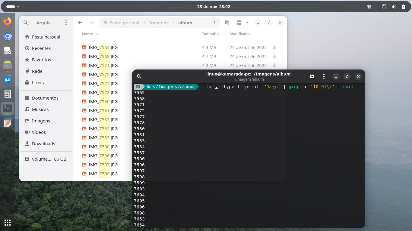 Comments Read more ›Eu precisava listar fotos que estavam em uma pasta, mas apenas os números delas. As fotos estavam nomeadas como saíram da câmera: IMG_7565.JPG, IMG_7568.JPG, IMG_7571.JPG… Eu precisava apenas dos números: 7565, 7568, 7571… a pasta tinha apenas 30 fotos, eu poderia em poucos minutos digitar os números um a um. Mas como bom usuário de...