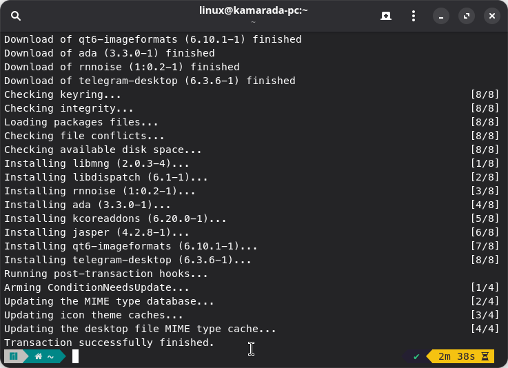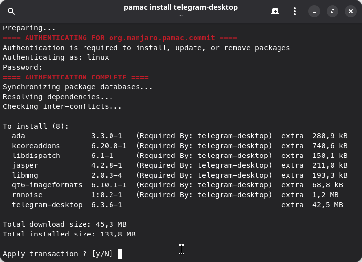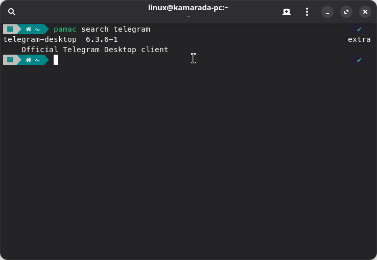 After identifying the packages you want to install, you can install them using the pamac install command. In this example, we see that the Telegram app is provided on Manjaro by the telegram-desktop package. To install it, we can use: