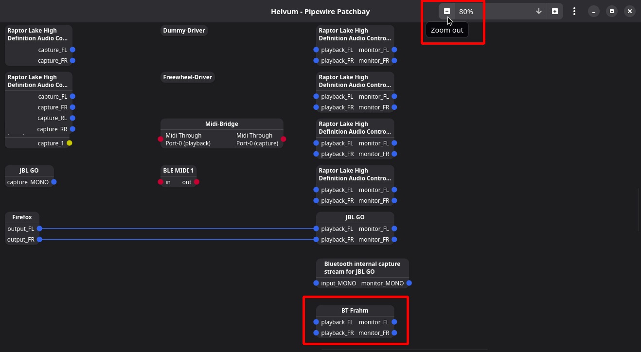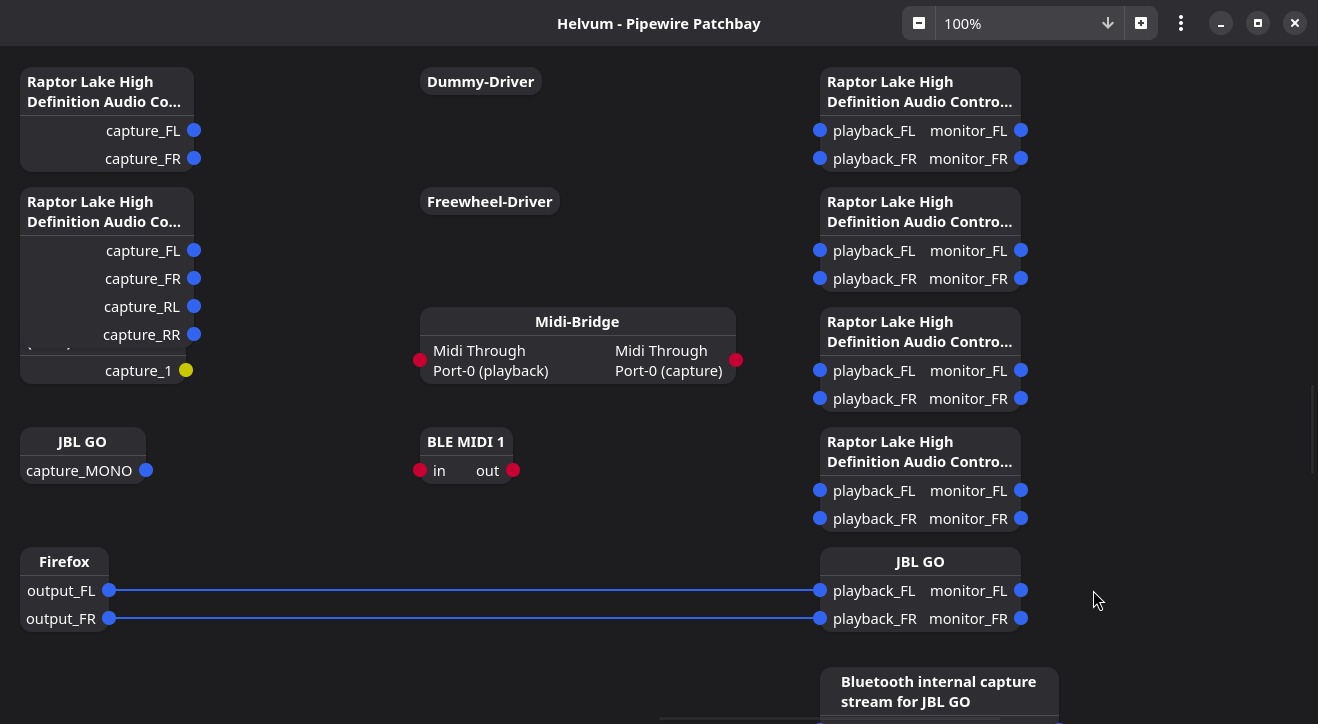 In this example, we can see that the Firefox browser’s audio outputs (output_FL and output_FR) are connected to the JBL GO speaker’s audio inputs (playback_FL and playback_FR) and sending sound to be played. Try pausing the music in the browser and you’ll see this line become dashed, indicating that the connection exists but is not sending sound.