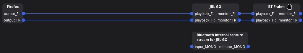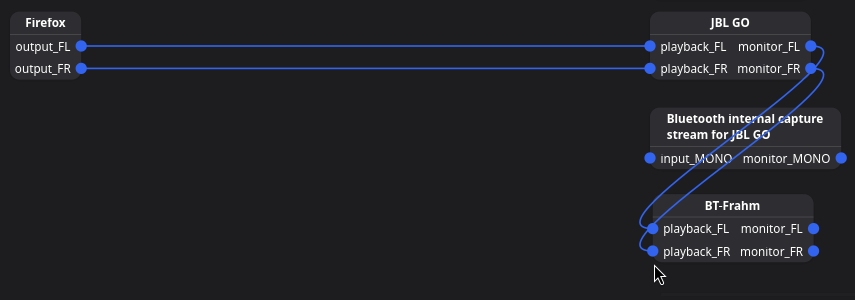 To make the JBL GO and BT-Frahm speakers play the same sound simultaneously, connect the sound outputs of the first (monitor_FL and monitor_FR) to the sound inputs of the second (playback_FL and playback_FR). To do this, you can drag one to the other and the app will draw the line: