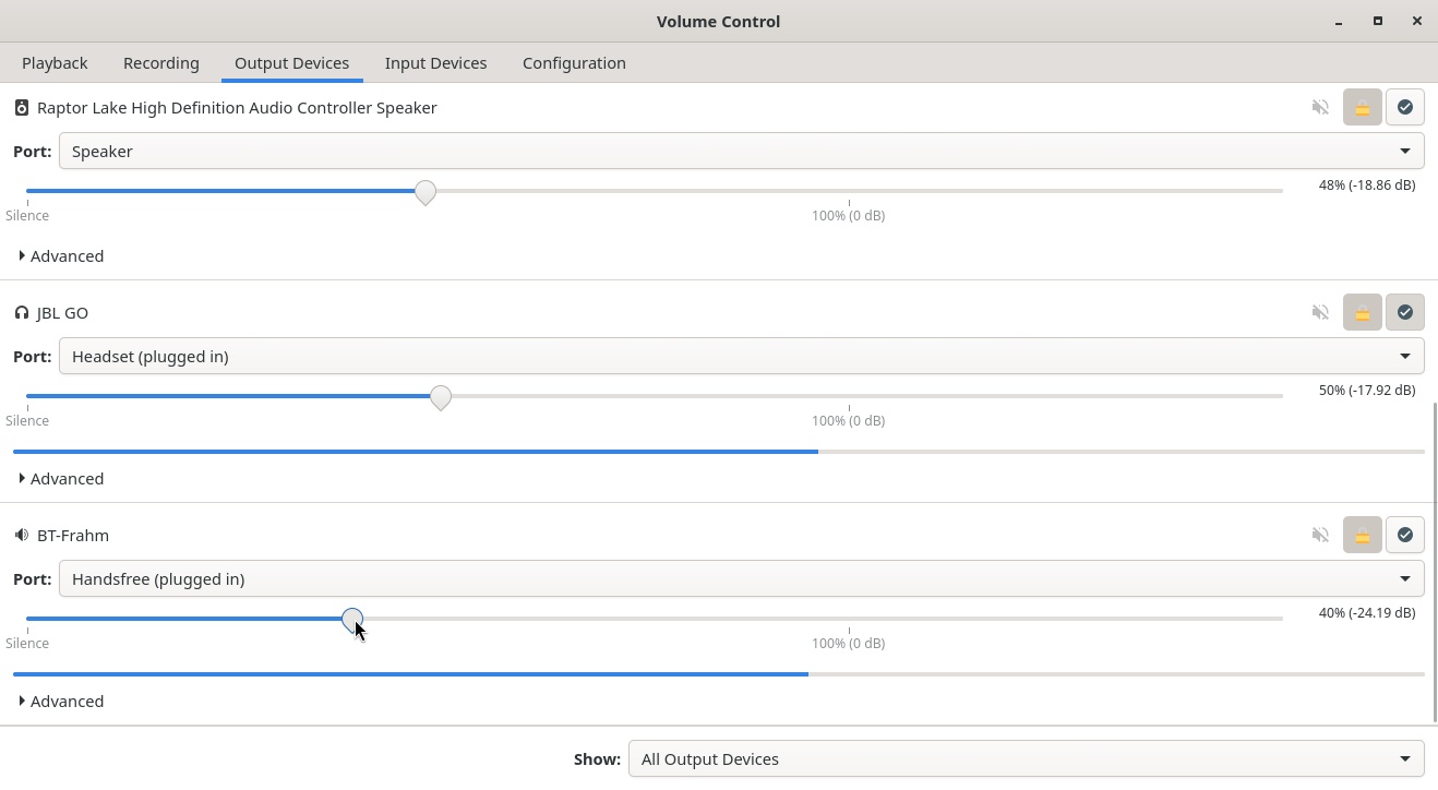 You may have noticed that the desktop volume control only affects the volume of the first speaker. To adjust the volume of both speakers, we’ll use another app, which is PulseAudio’s Volume Control. To install it, install the pavucontrol package:
