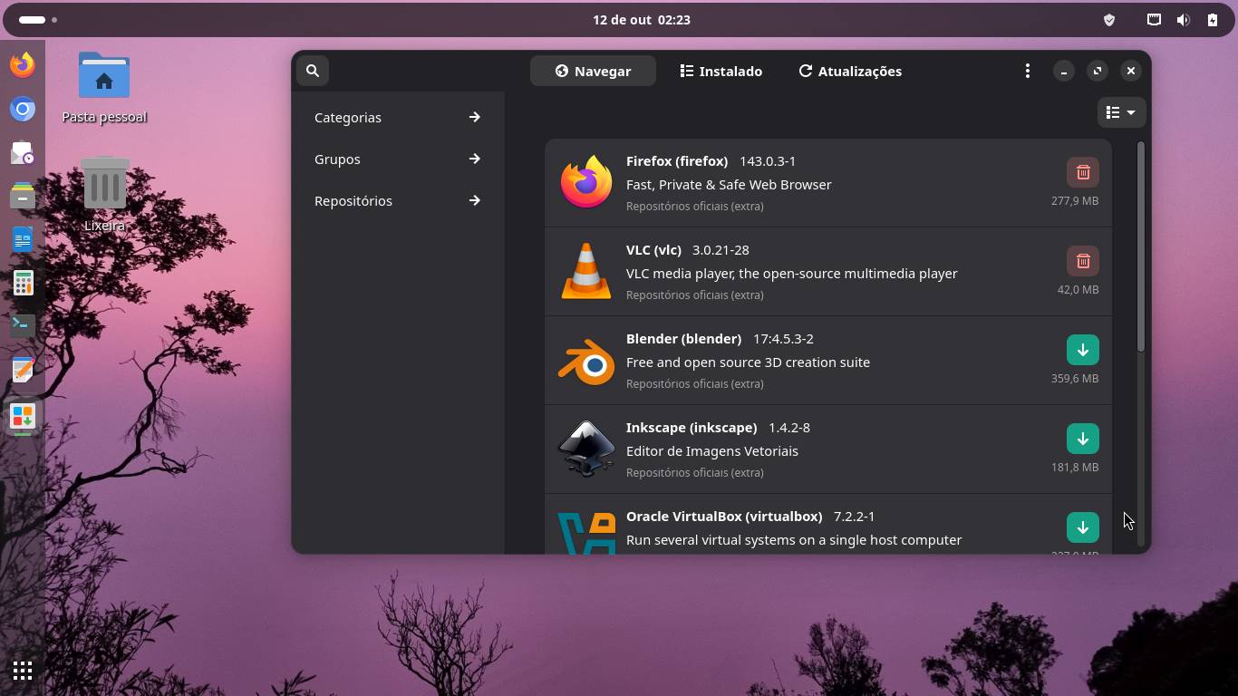 Assim como o openSUSE Leap fornece pacotes binários no formato rpm, tanto o Manjaro quanto o Arch Linux fornecem pacotes binários no formato pkg.tar.zst. E possuem, além de seus repositórios oficiais de pacotes binários, o Arch User Repository (em português, “repositório dos usuários do Arch”, mais conhecido por AUR), que é um repositório comunitário de scripts de compilação chamados PKGBUILDs. Em vez de fornecer pacotes binários prontos, o AUR entrega instruções que o sistema segue para criar e instalar os pacotes localmente. Dá pra instalar dos programas mais famosos aos mais improváveis a partir do AUR.