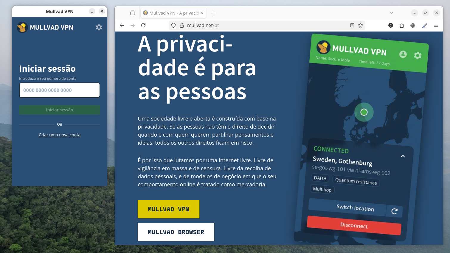 A Mullvad é um serviço de VPN amplamente reconhecido por seu foco extremo em privacidade e anonimato. Diferente da maioria dos concorrentes, não exige e-mail nem qualquer dado pessoal para criar uma conta, utilizando apenas um número aleatório como identificador, o que impede a associação entre usuário e atividade online. O serviço adota uma política rigorosa de no-logs, auditada de forma independente, e opera com servidores em RAM (sem armazenamento permanente de dados). Além disso, oferece aplicativos de código aberto e opções de pagamento anônimas (incluindo dinheiro e criptomoedas). Custa 5 euros por mês (cerca de 30 reais, na cotação atual).